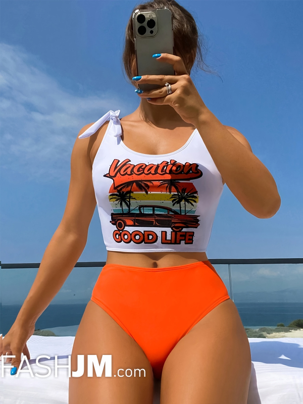 Vacation Style Car Coconut Tree Print Tie Shoulder 2 Piece Set Tankini, Scoop Neck Orange Stretchy Swimsuits, Women's Swimwear & Clothing